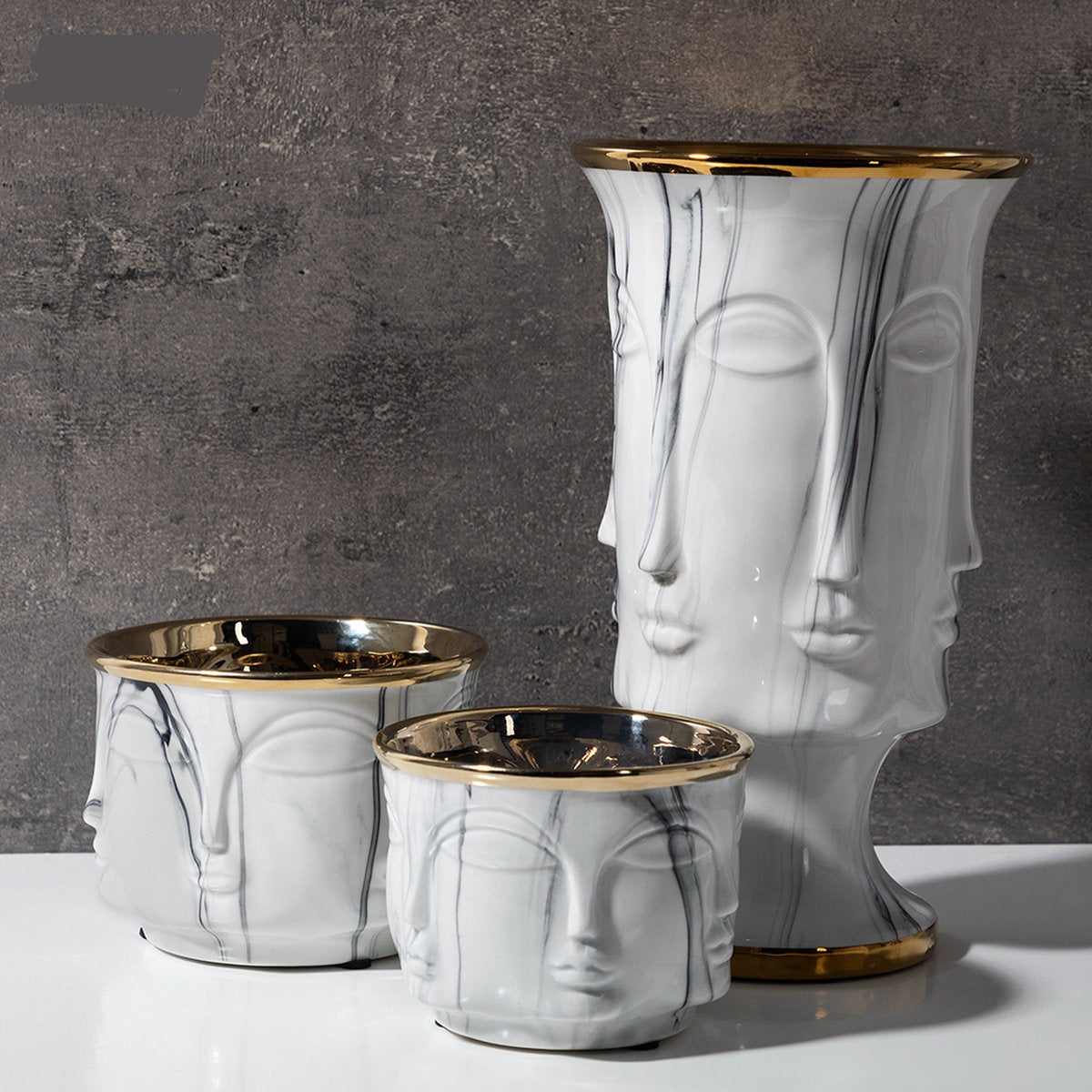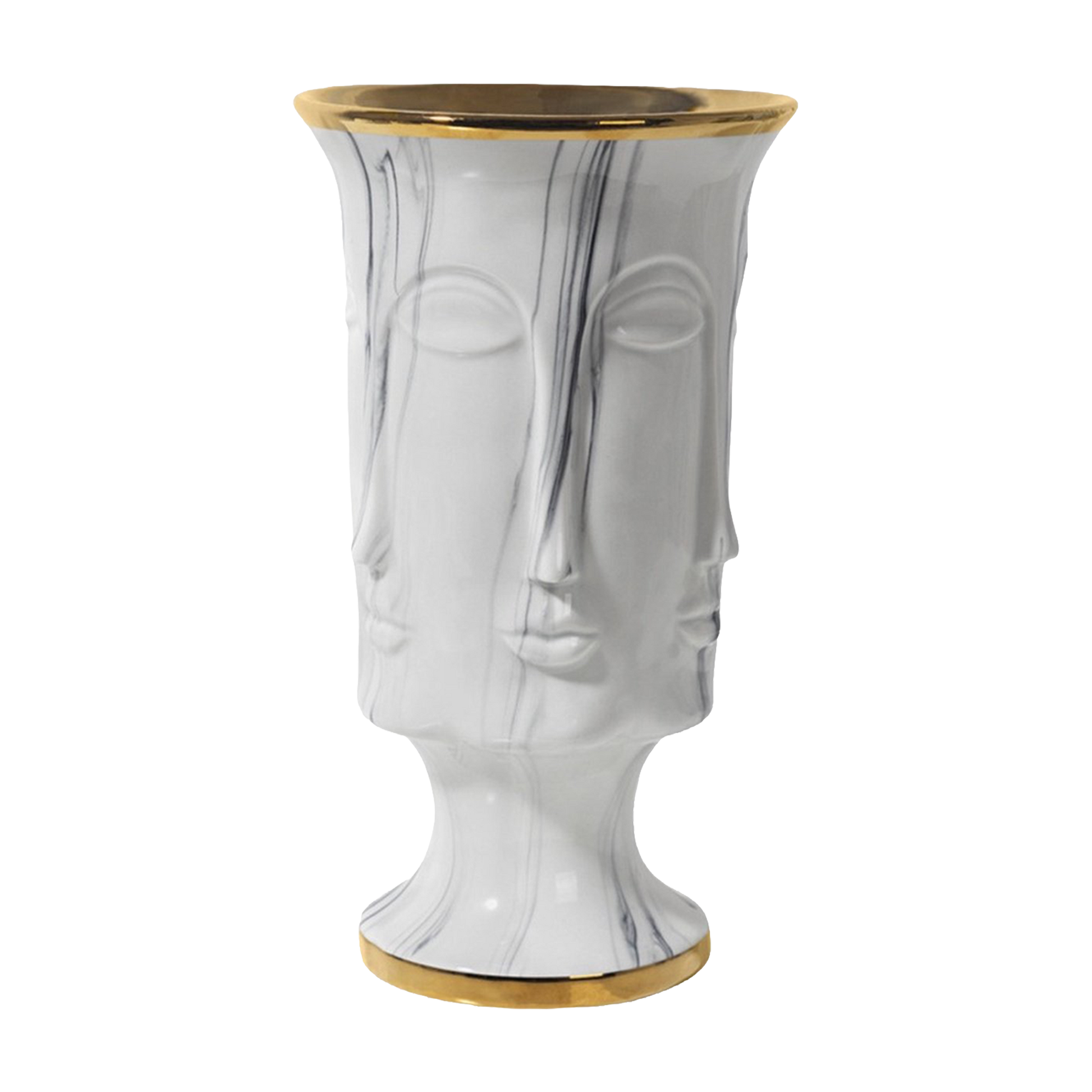 ARTE is een sculptuur vermomd als vaas. De zachte gezichtscontouren en de glanzende marmerstructuur geven het ontwerp een artistieke, bijna museale uitstraling, terwijl de goudkleurige randen een warme, luxueuze gloed toevoegen. Het geheel voelt tegelijkertijd modern en tijdloos: een object dat meteen de aandacht trekt en elke ruimte een vleug verfijning geeft. ARTE brengt kunst en design samen in één statementpiece dat moeiteloos op zichzelf staat — met of zonder bloemen.