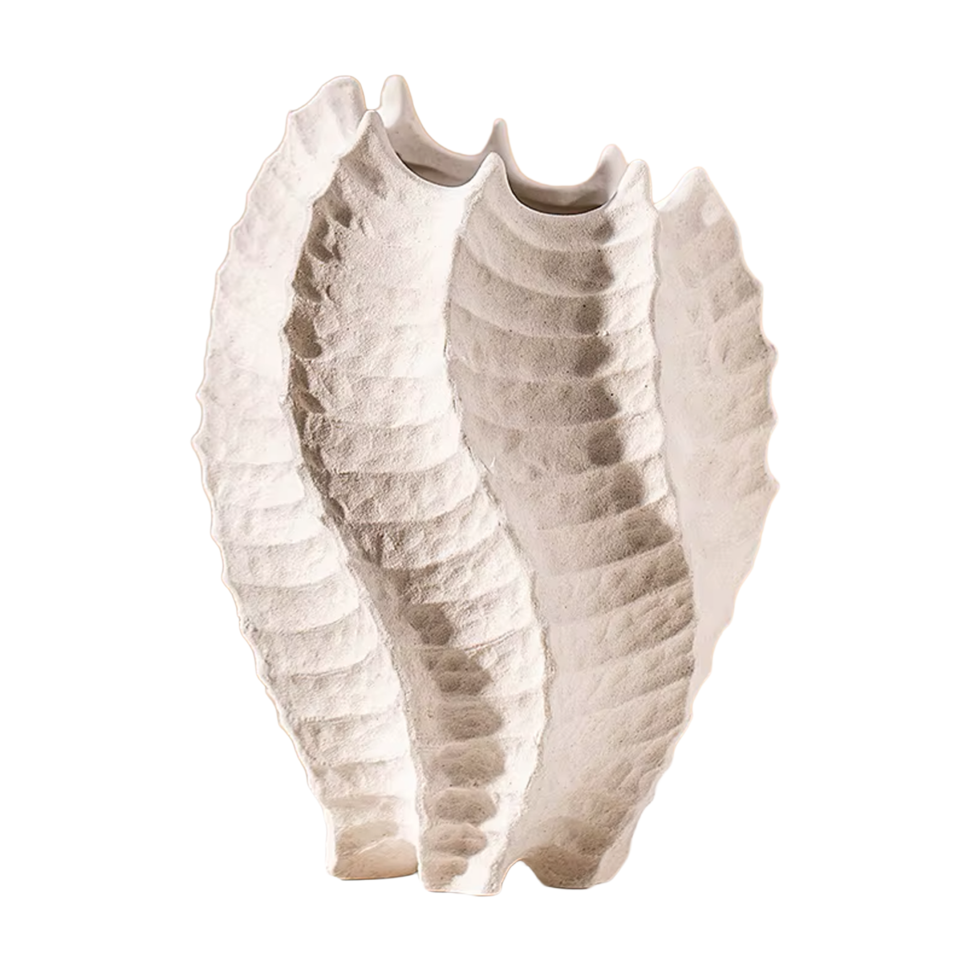 Vervaardigd uit keramiek met matte zandafwerking en golvend reliëf. Hoogte: 24,3 cm, breedte: 14,8 cm, lengte: 17 cm. Elk exemplaar wordt handmatig gevormd, waardoor de textuur subtiel kan variëren.